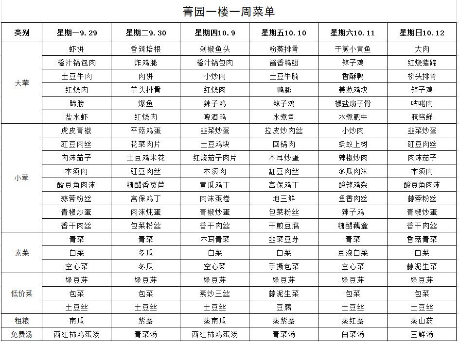 每周菜单(9月29日-10月12日)