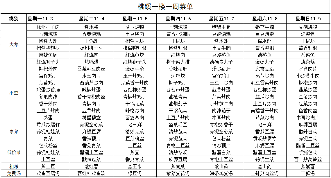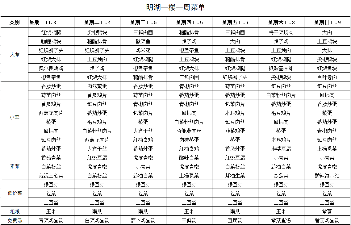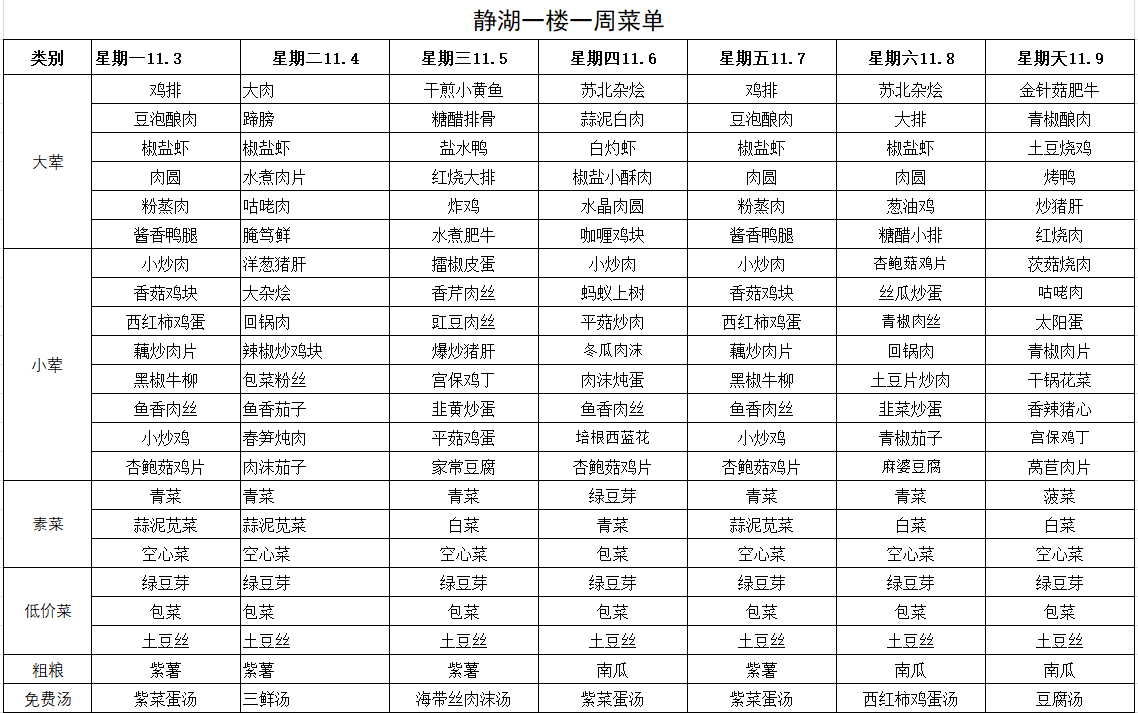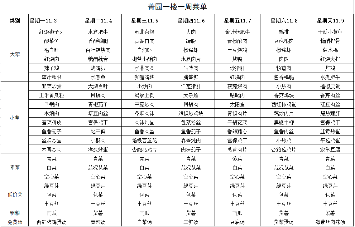每周菜单(11月3日—11月9日)