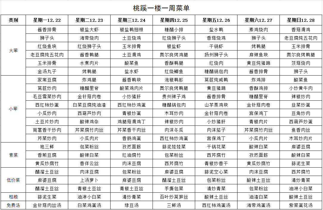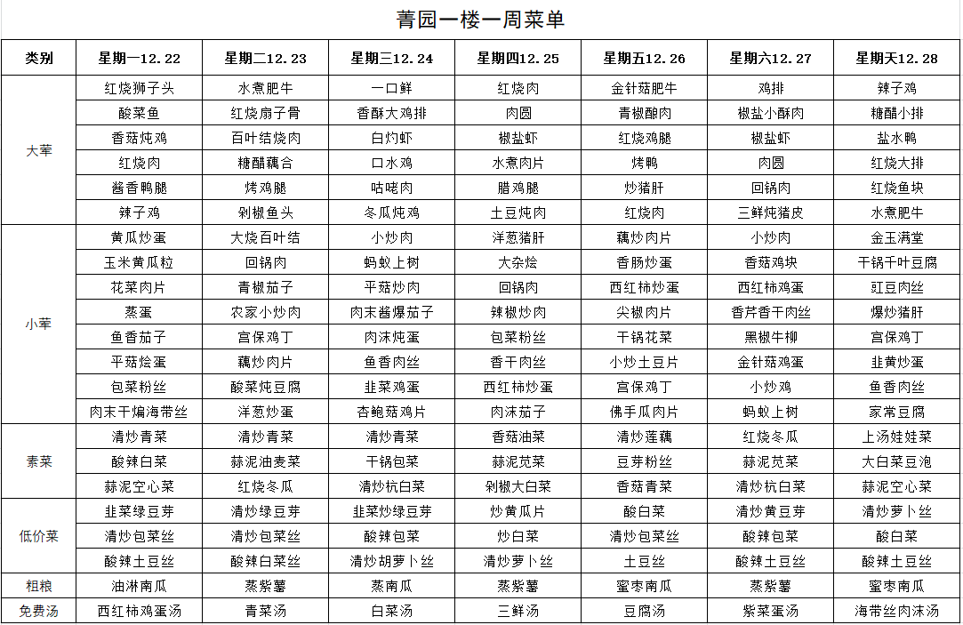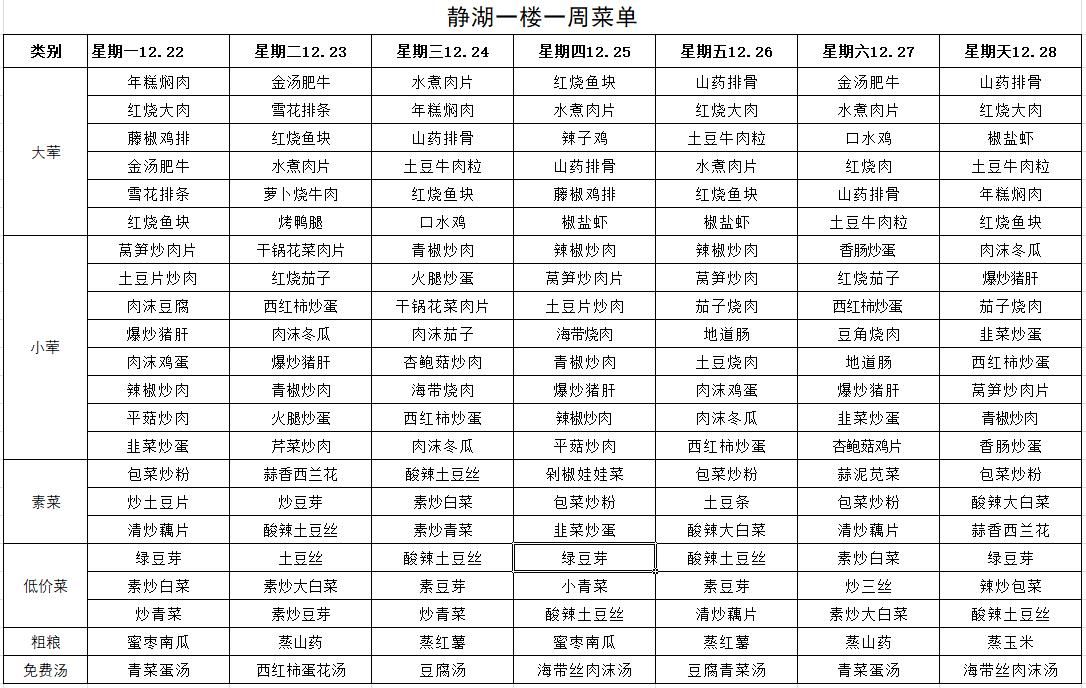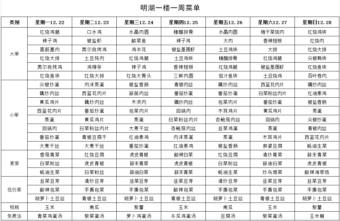 每周菜单(12月22日—12月28日)