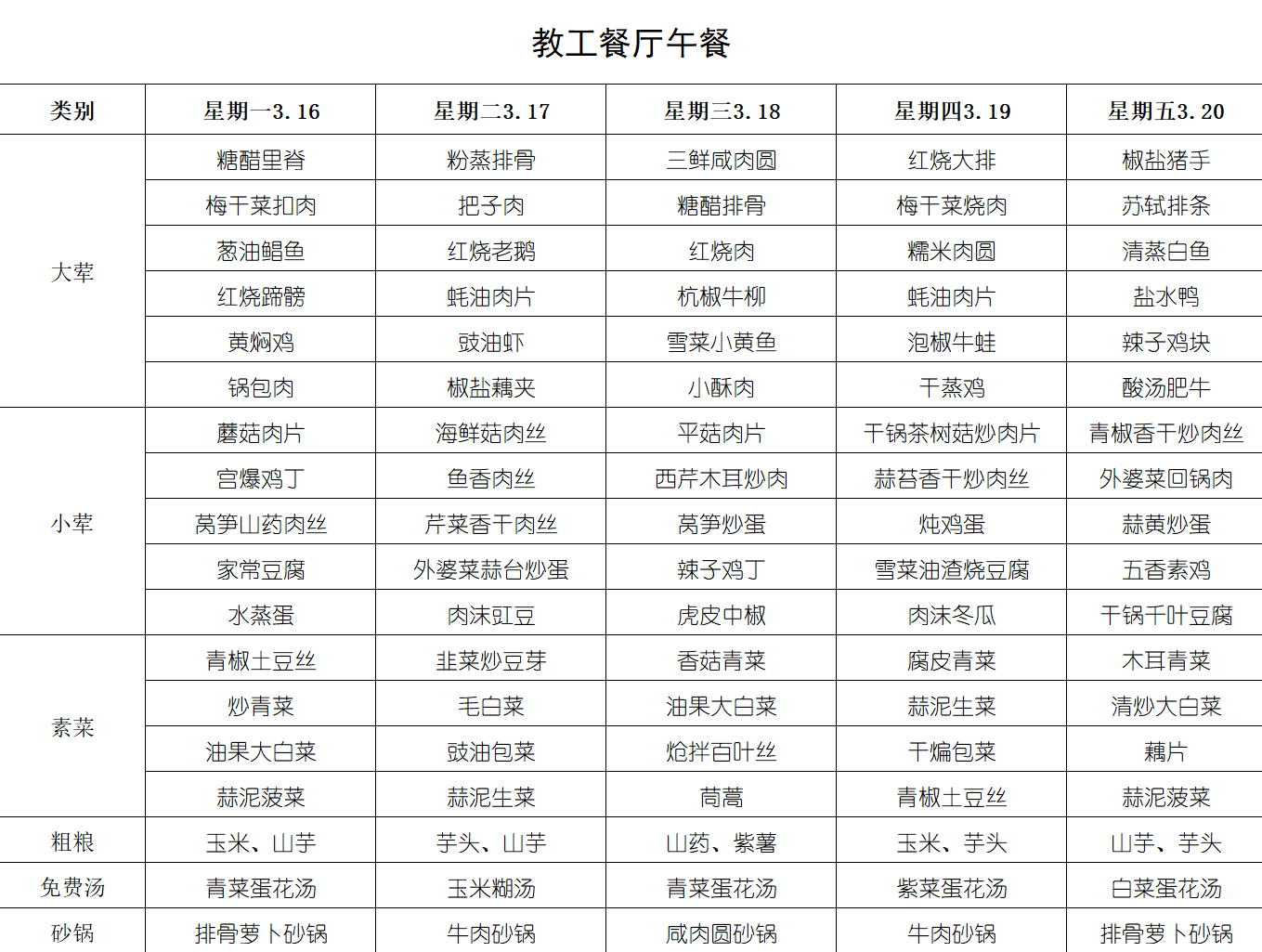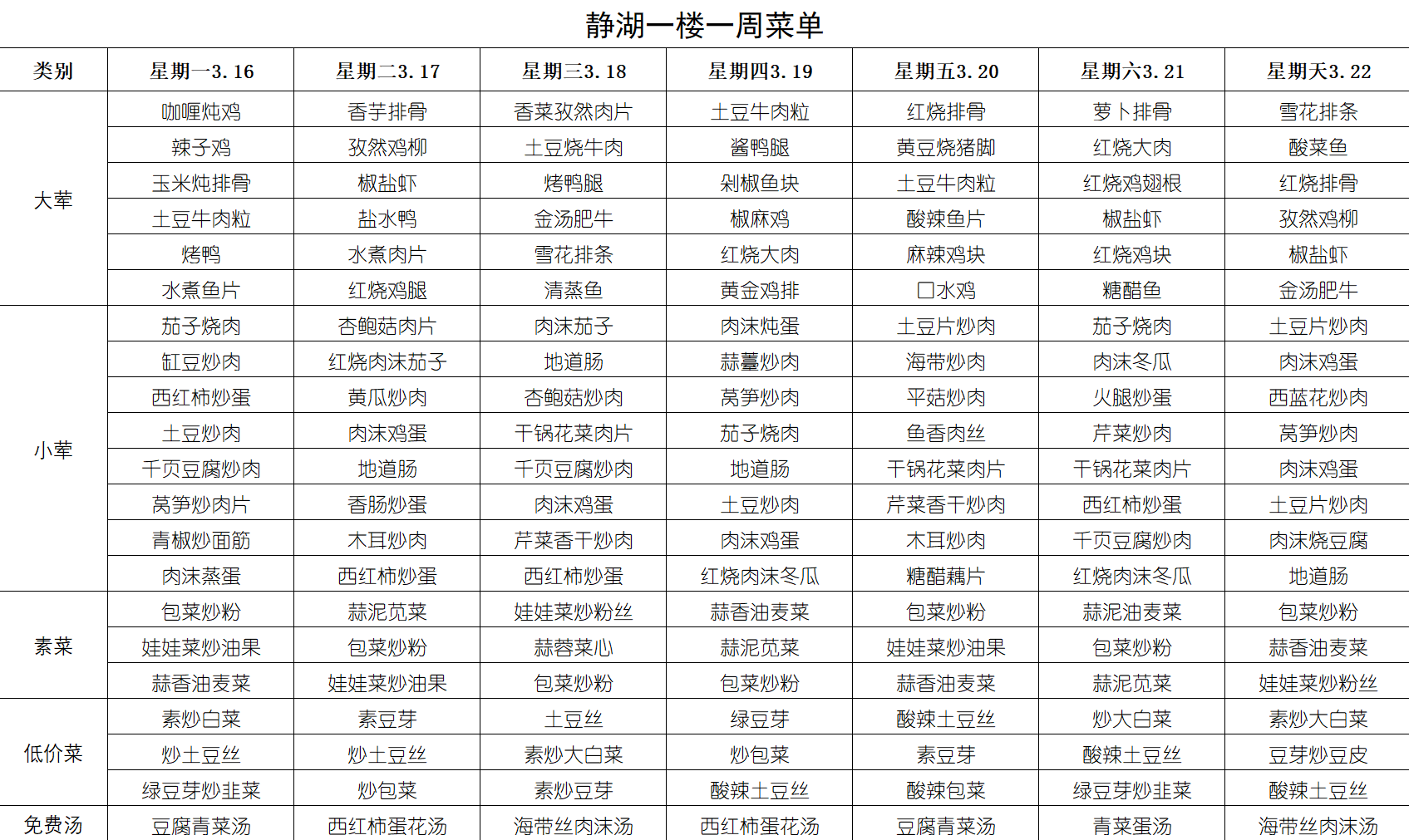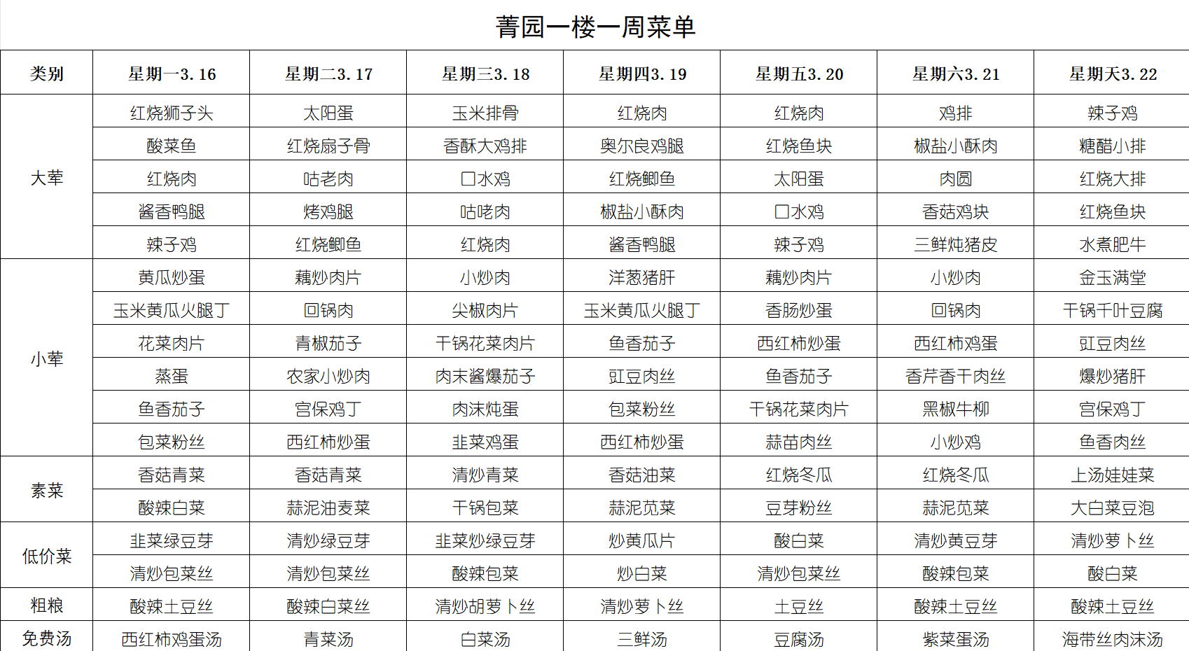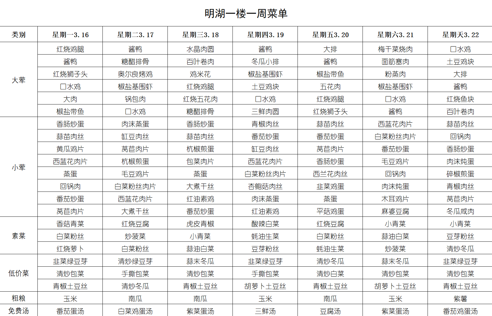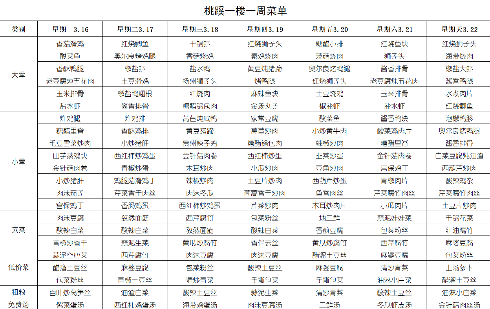 每周菜单(3月16日-3月22日)