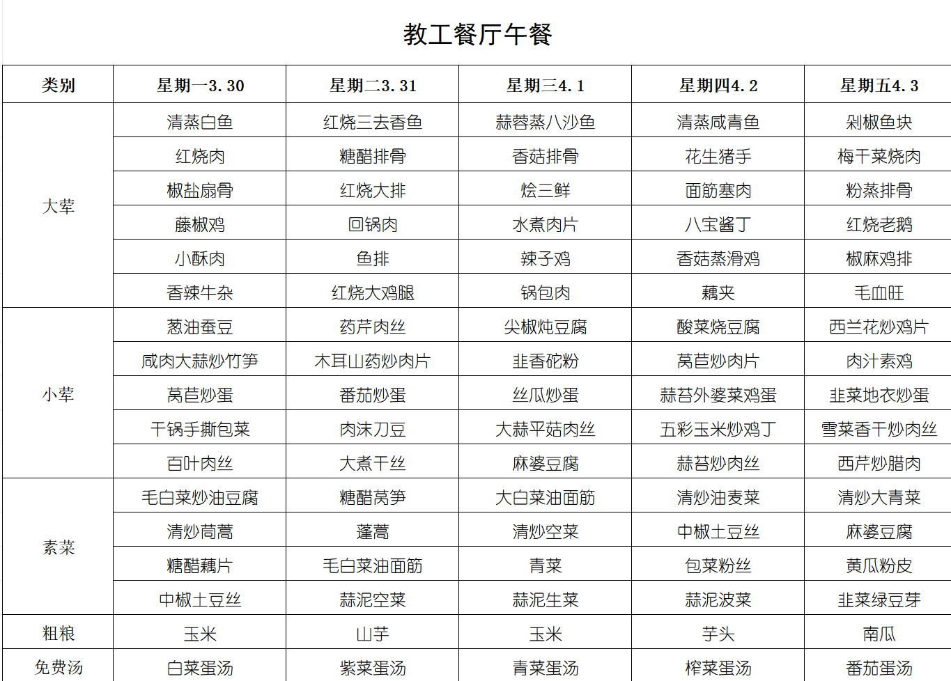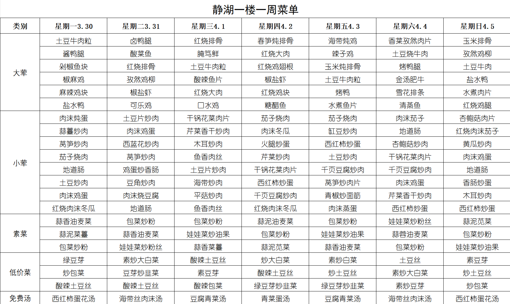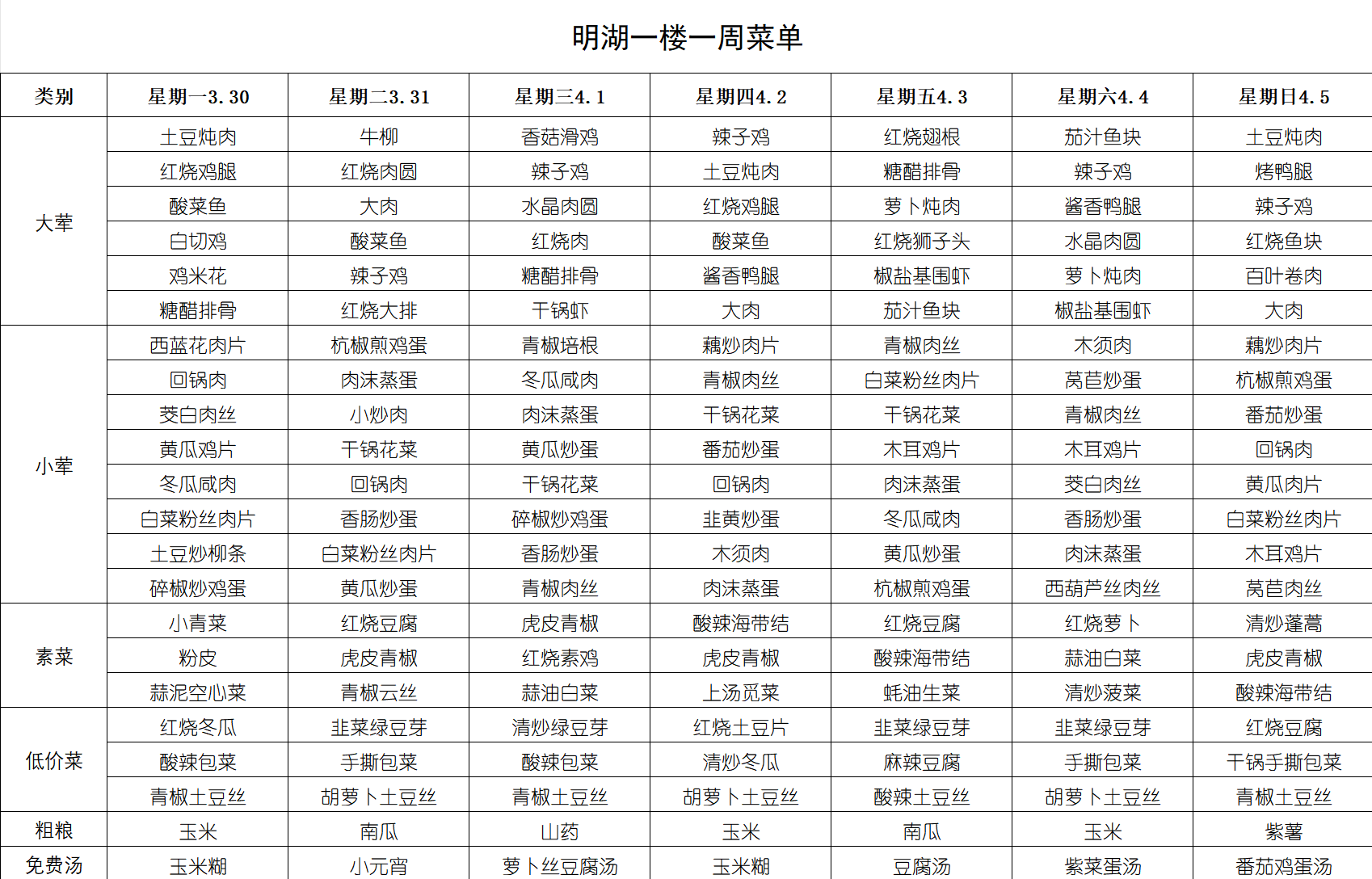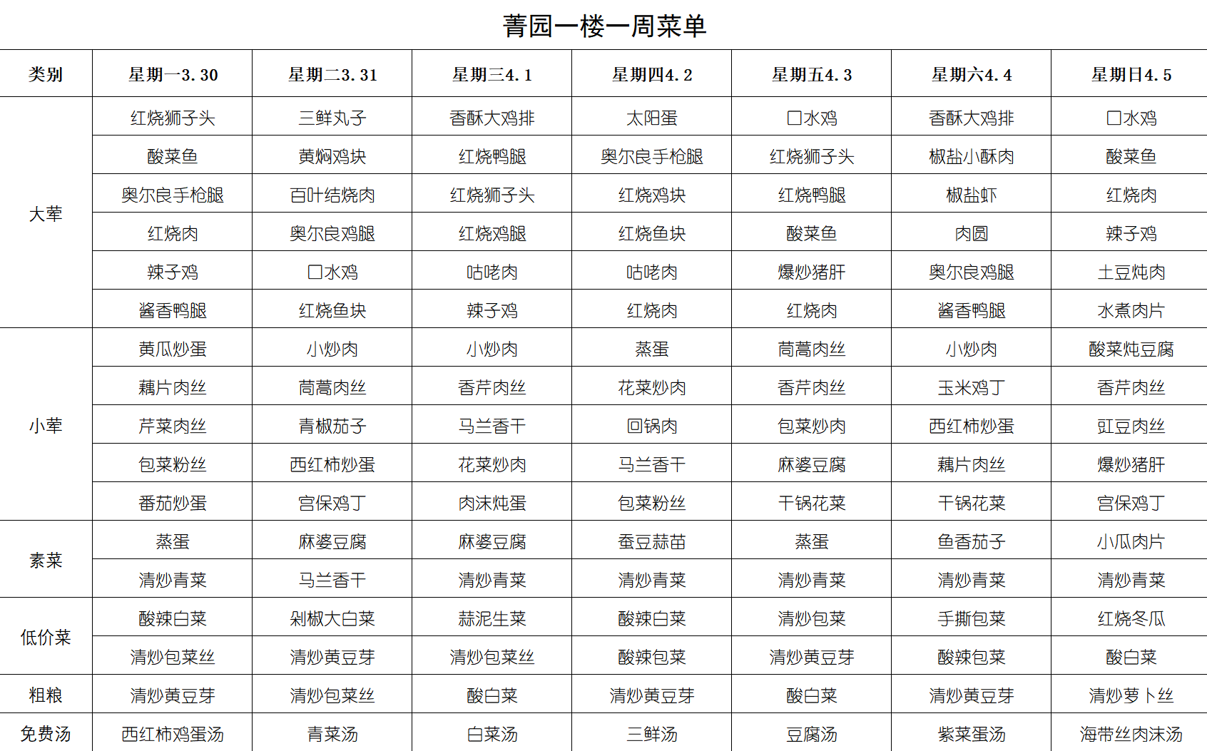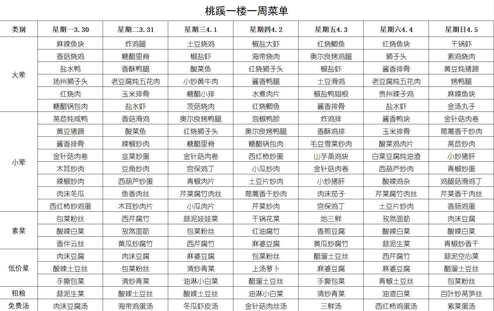 每周菜单(3月30日-4月5日)