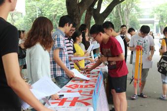 7月2日中午,校本部二食堂门口、新北校区食堂门口人头掇动,同学们在“尚德守法 关注食品安全关爱生命健康”的横幅上郑重签下自己的名字。很多同学在签名台前食品安全宣传展板处驻足观看,这里正举行我校2015年食品安全宣传周系列活动之一─签名活动。