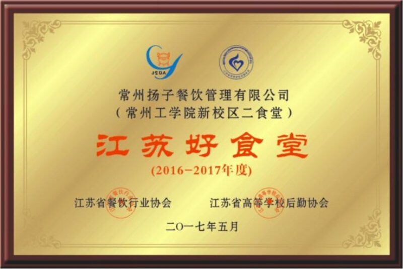 2017年5月26日,在苏州举办的“2017江苏团膳快餐发展大会”上,我校辽河路校区由常州扬子餐饮管理有限公司托管的菁园餐厅荣获“2016-2017江苏好食堂”称号。