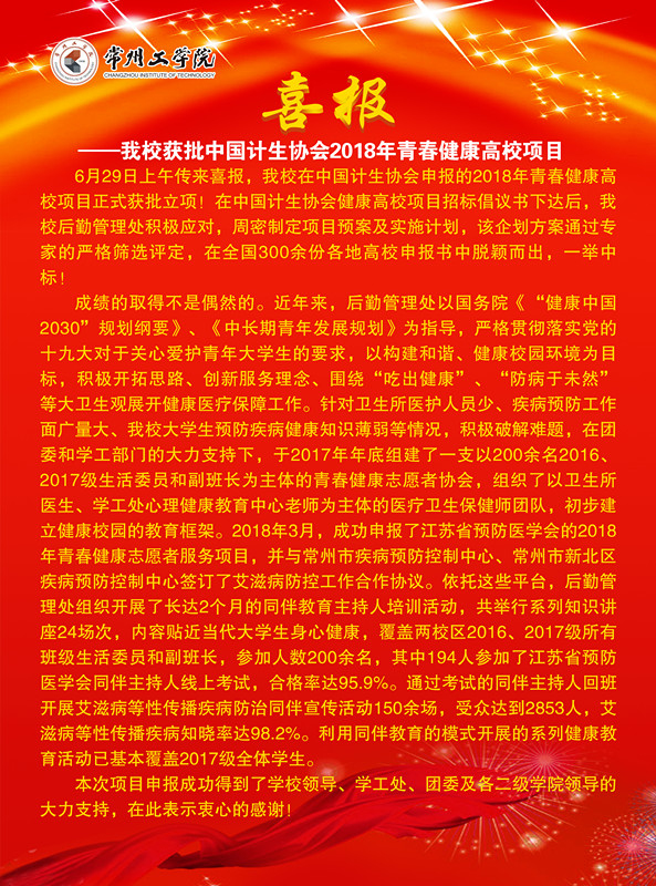 喜报——我校获批中国计生协会2018年青春健康高校项目