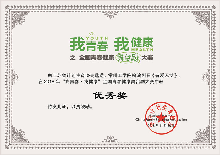 近日,由校后勤管理处指导、青春志愿者协会自编自导自演并组织拍摄的防艾舞台剧《有爱无艾》,继获江苏省计生协会评选的三等奖以后,被推送到“我青春 我健康”全国舞台剧大赛中再获优秀奖。